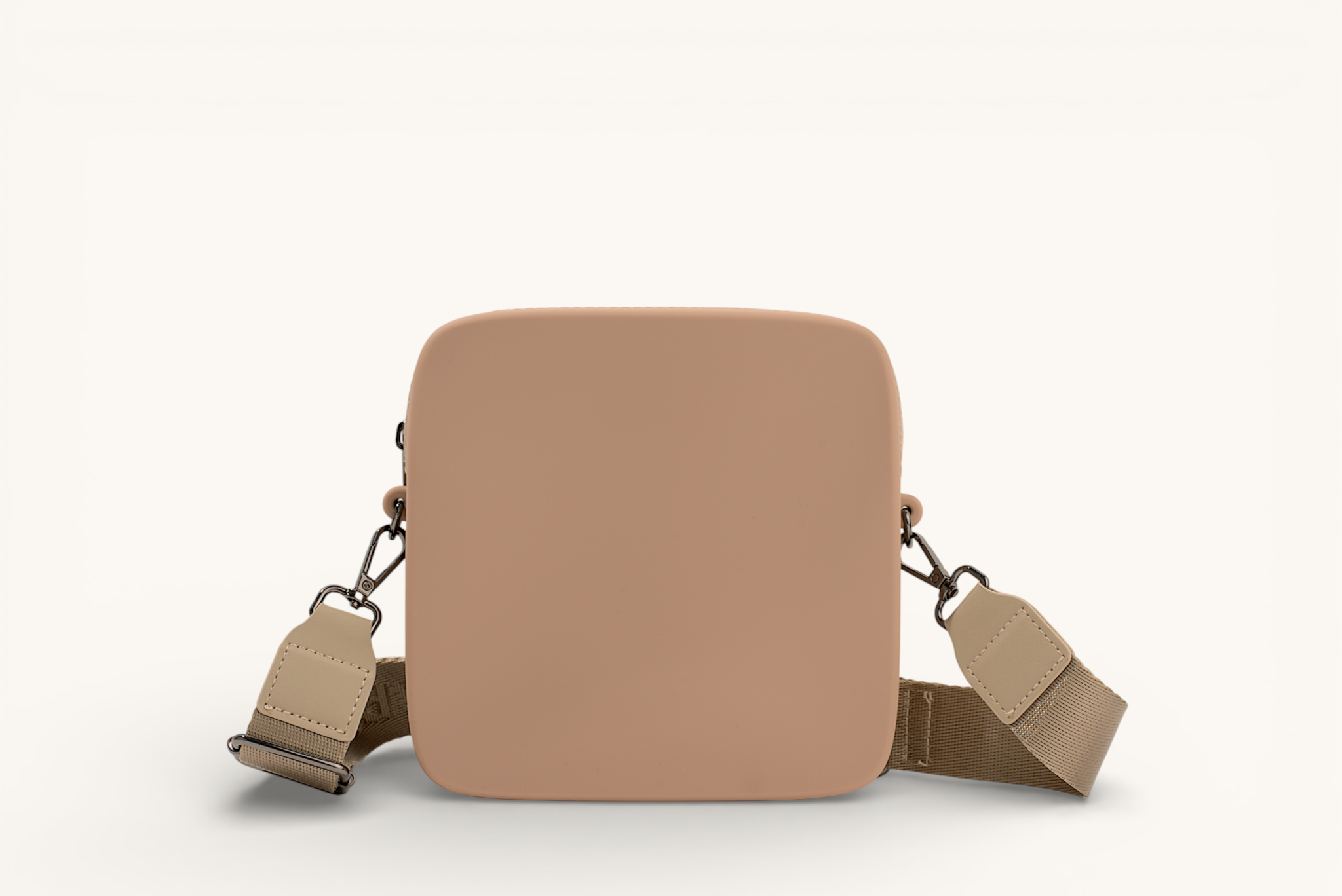 Our Caramel Latte Mini Quad crossbody bag is a sophisticated, everyday companion crafted from soft, vegan friendly silicone. The beige square crossbody bag combines elegance with practicality, with a smooth surface and durable strap. Perfect for commuting or casual outings, it brings modern luxury to your daily essentials.
